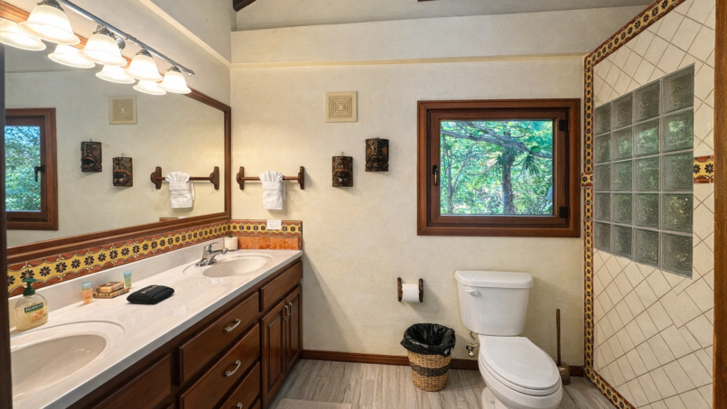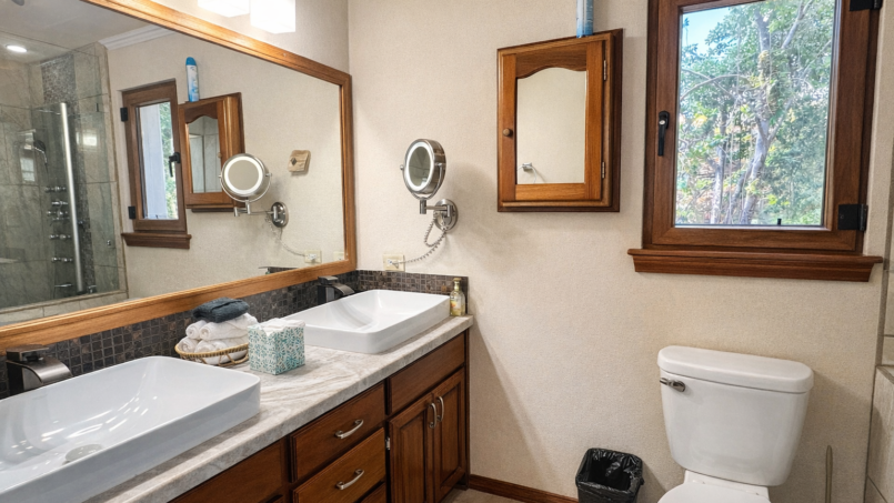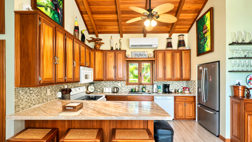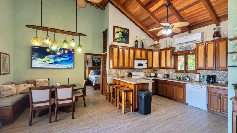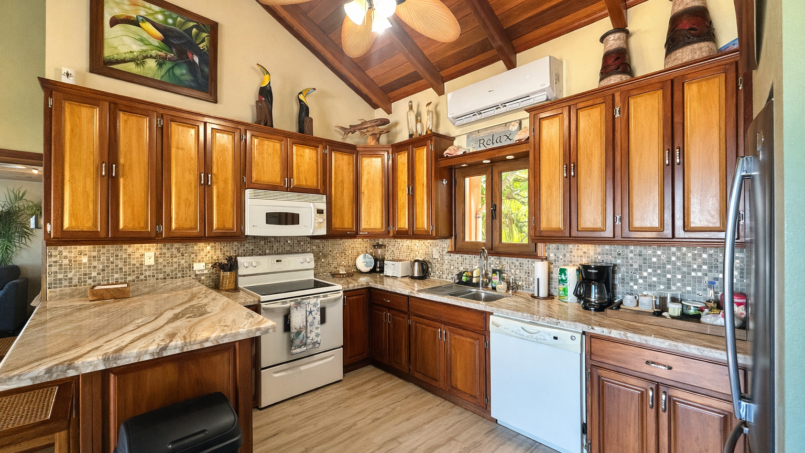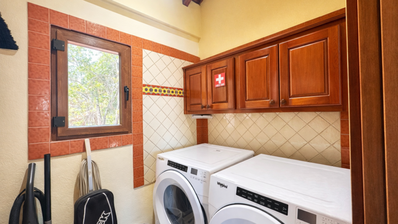 Back in the central living area, the kitchen stands ready fully equipped with everything you need. Cook together or not at all. There’s a dishwasher for effortless cleanup and a waste disposal (just remember to run water and avoid oils, citrus, or plastics). The laundry room washer, dryer, detergent, dryer sheets is tucked conveniently away so longer stays feel seamless.